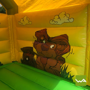 Die Safari Hüpfburg verfügt über ein Regen-/ Sonnendach sowie ein Sicherheitsnetz über der Rückwand.